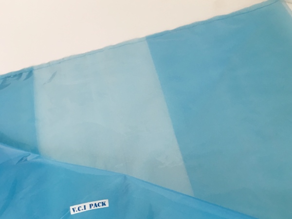 VCI氣相防銹膜(防銹袋)是將高分子聚乙烯樹脂(LDPE)與功能VCI樹脂配比混合,采用現(xiàn)代薄膜共擠技術(shù)生產(chǎn)的新一代復(fù)合防銹薄膜。具有良好的氣化防銹性能、阻隔防潮、使用方便、透明直觀等特點;當(dāng)用塑料袋包裹金屬產(chǎn)品時,氣相緩蝕劑在封閉空間內(nèi)氣化并凝聚在所有金屬表面上形成氣相保護層,從而防止金屬產(chǎn)品銹蝕。符合GB-T19532-2004防銹性能要求。